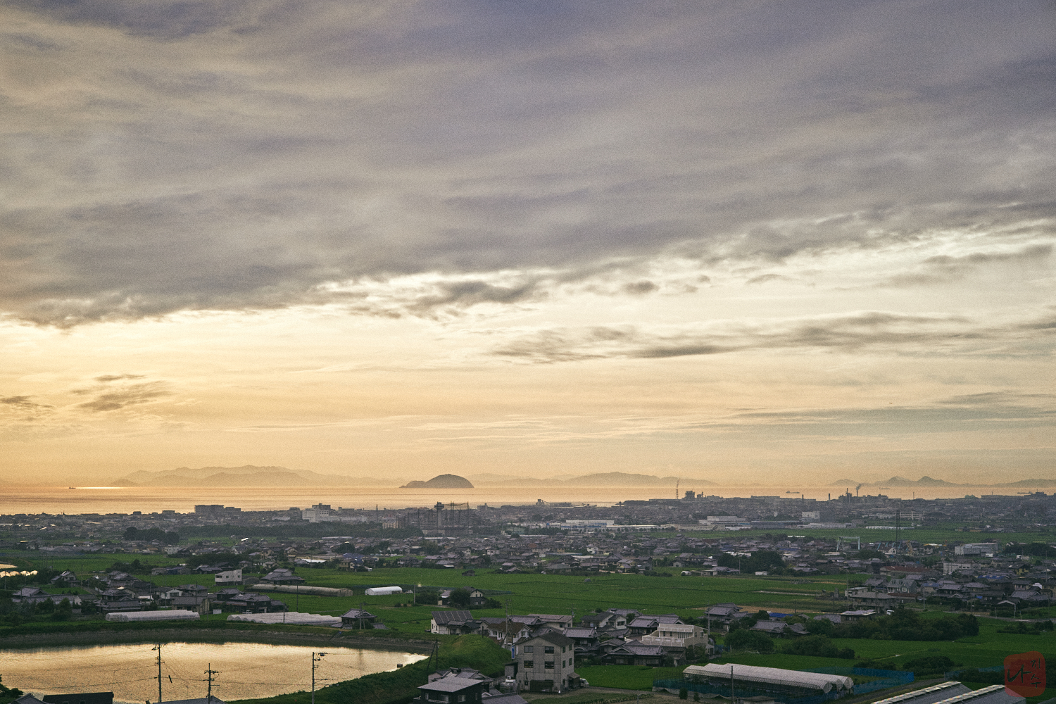 세토내해가 내려다 보이고 선로 하나가 지나고 있습니다