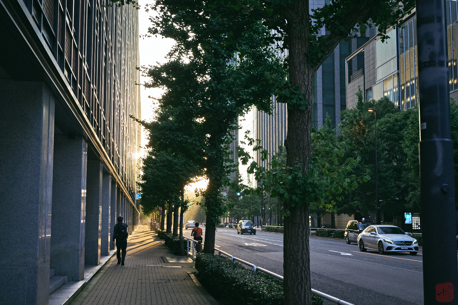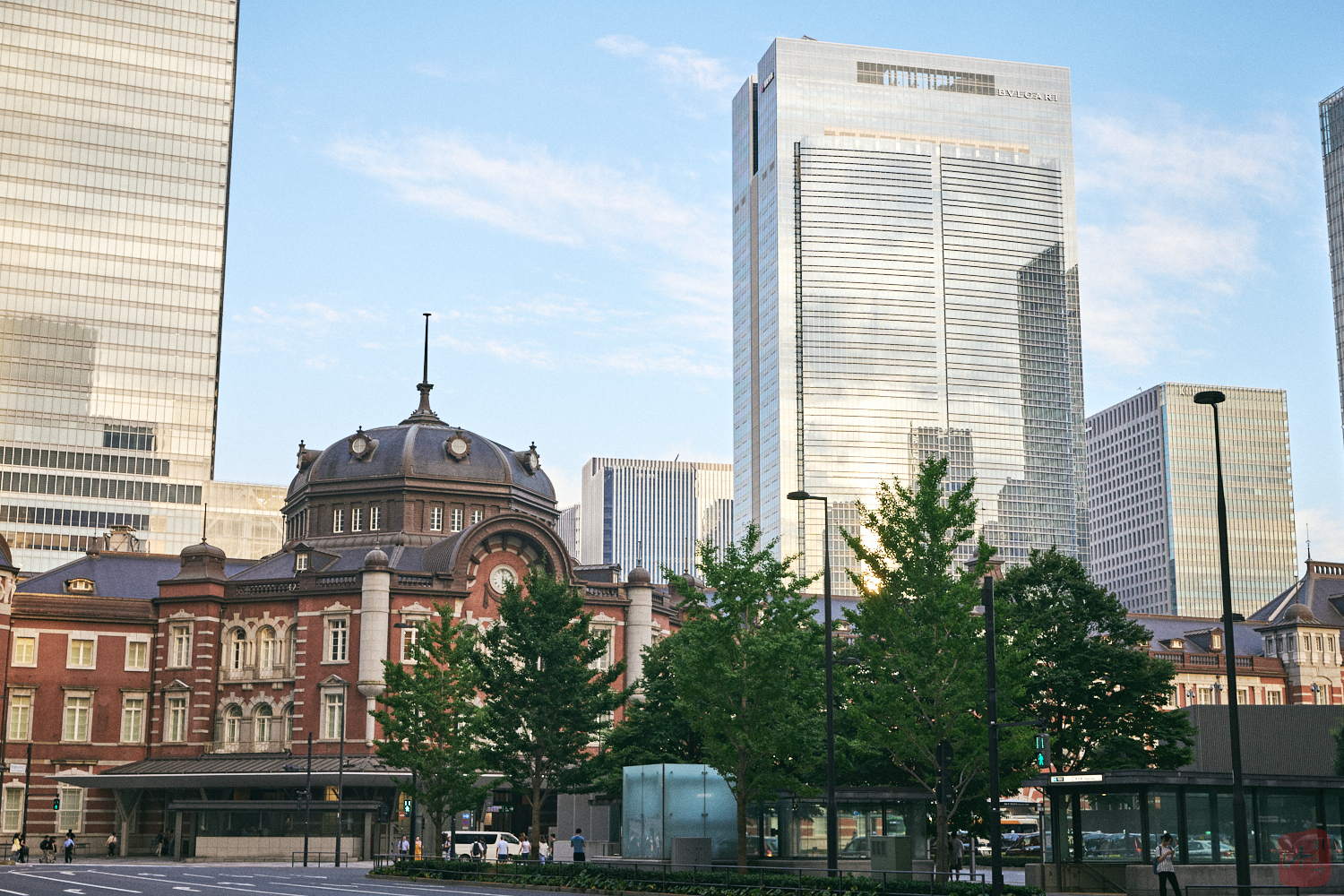 해질 녘 햇빛을 받고 있는 도쿄역과 마루노우치 광장이 보였습니다